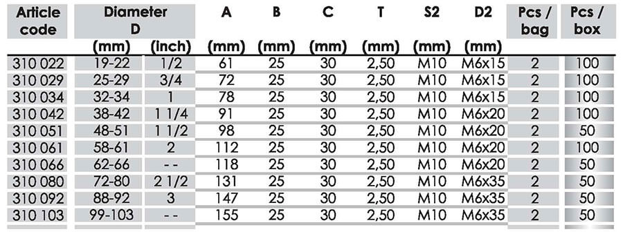 - max. allowed load, from dimension 108-114 to 210-225 (N) 5.400, from 245-255 to 600-625 (N) 9.800
